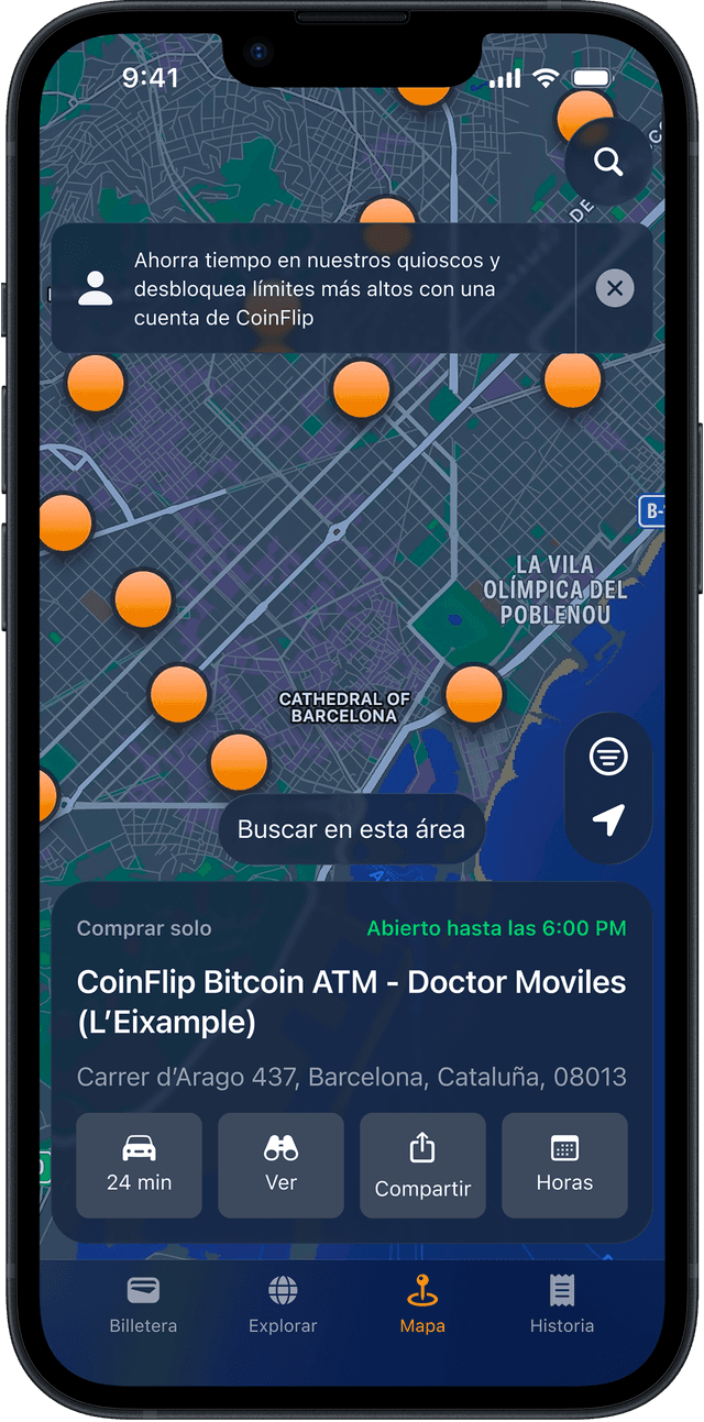 Compra cripto con efectivo en los cajeros automáticos CoinFlip. Usa la CoinFlip Crypto Wallet para encontrar un cajero cerca de ti.