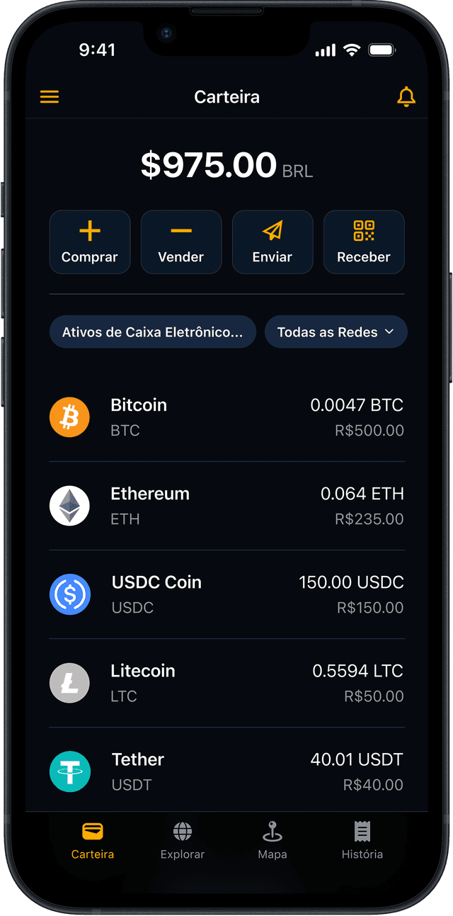 Transfira e transacione facilmente em qualquer lugar ou localize um caixa eletrônico CoinFlip para transações em dinheiro.